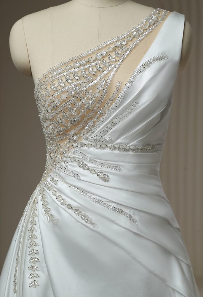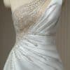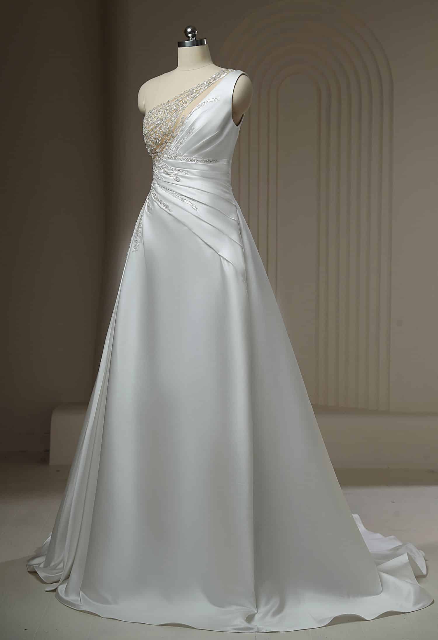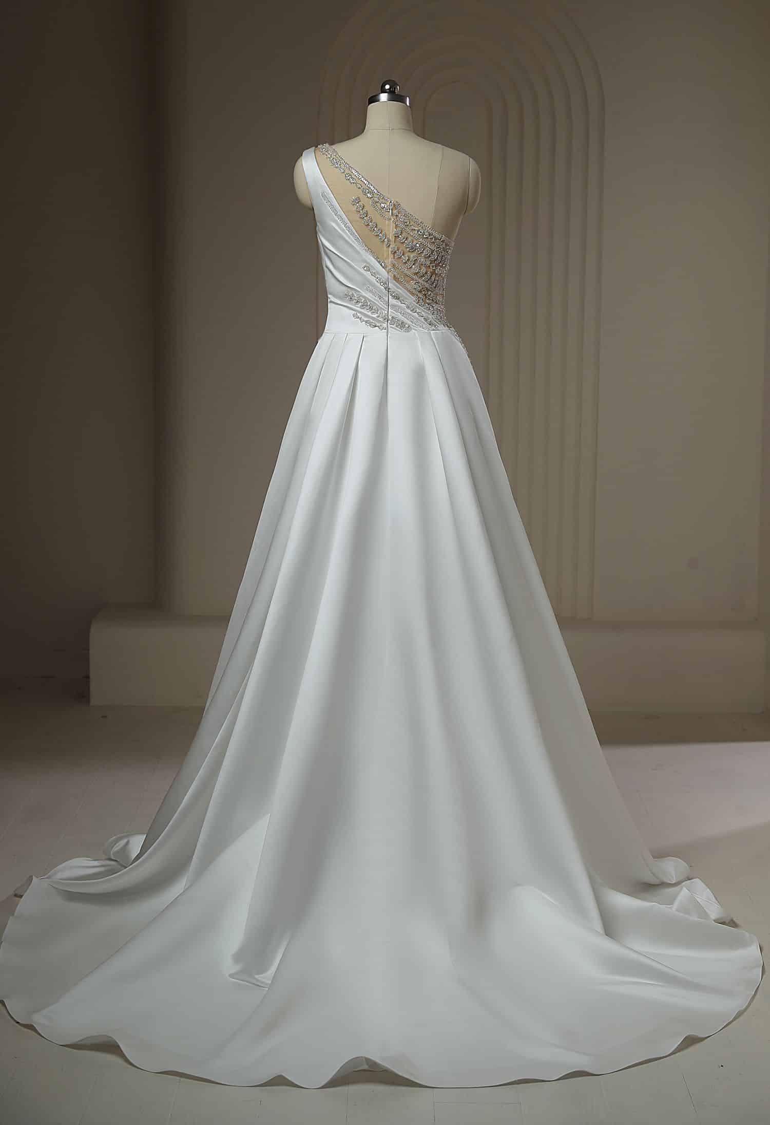 This stunning one-shoulder A-line wedding gown is designed for the bride who loves classic beauty with a touch of modern sophistication.
