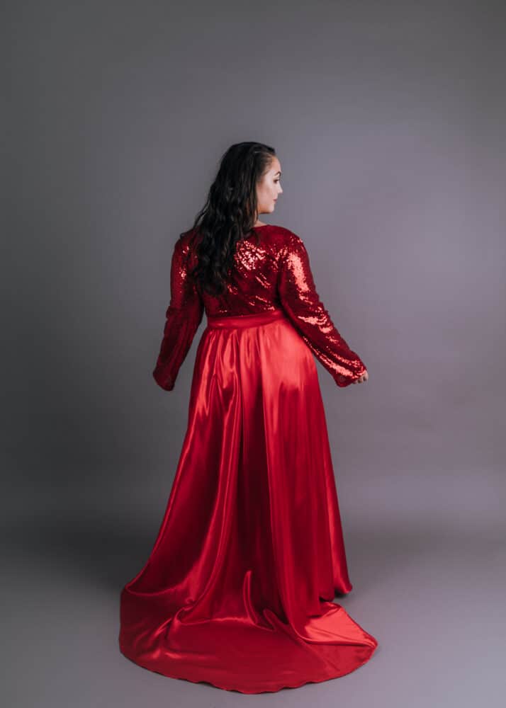 - Featuring a floor length sequined dress suitable for a range of formal events. This evening dress is perfect for the winter season with its full length sleeves. An elegant dress with a modest neck line is very flattering for all body types. Available in a warm, deep red colour which suits a wide range of skin tones. Can be customised to your colour of choice for the same price. Easy to wear with a central zipper on the back. Detachable satin skirt is also available with a simple daimante buckle to dress it up slightly.